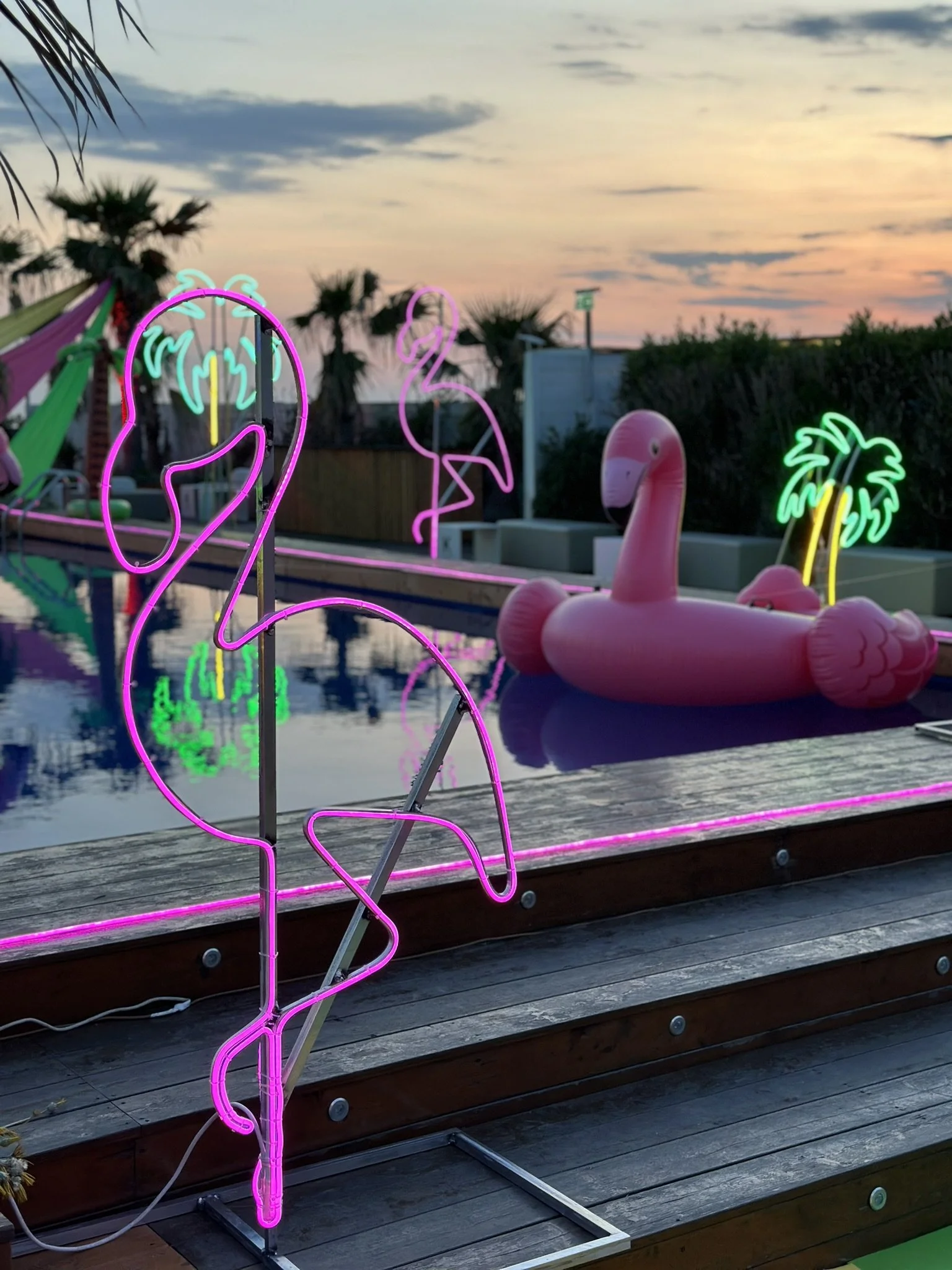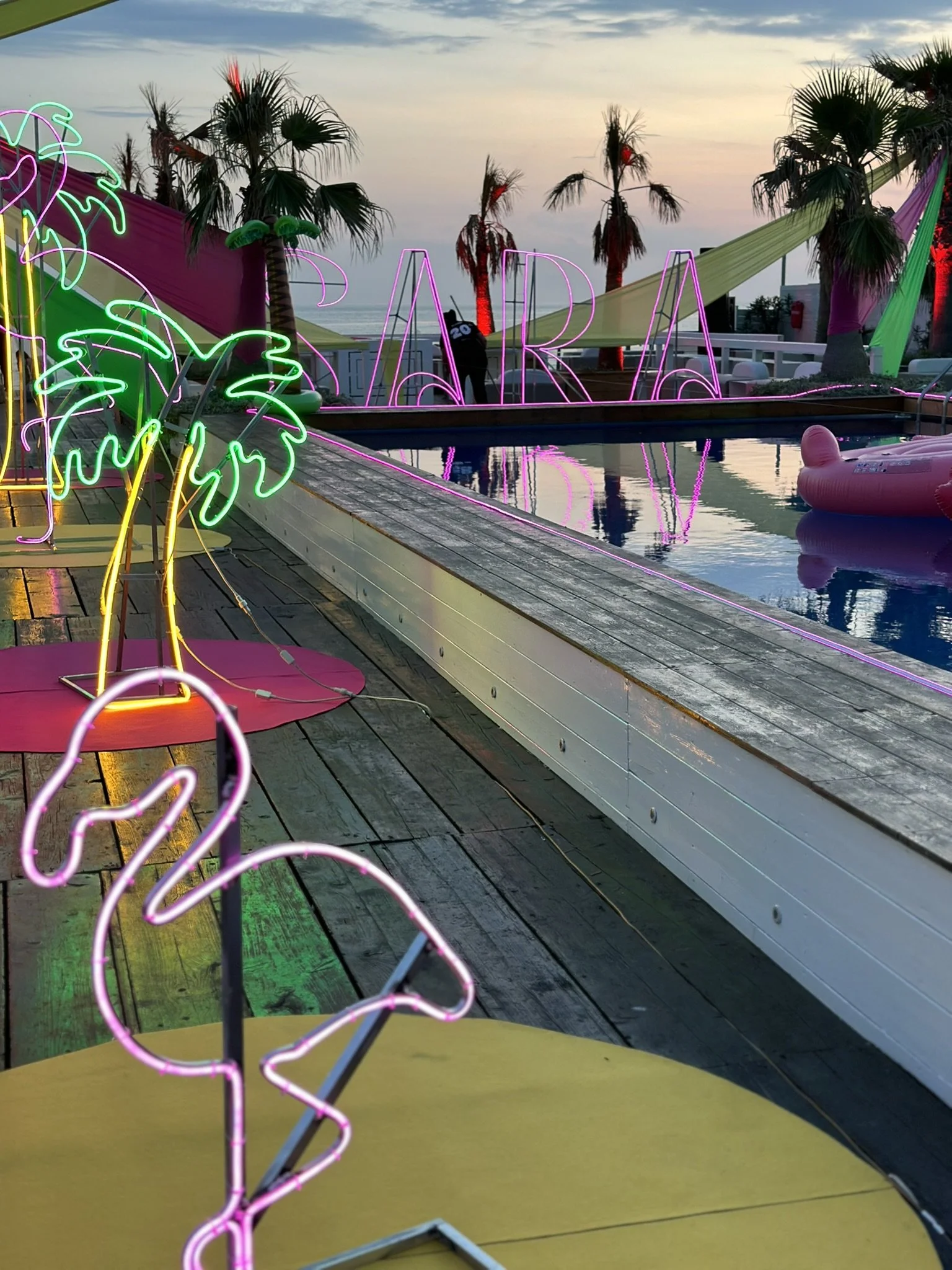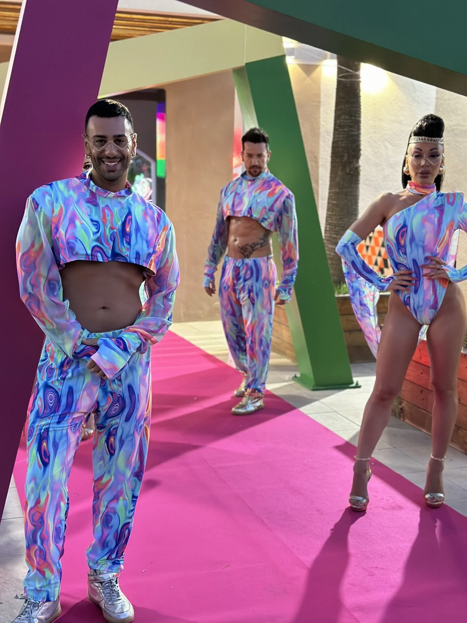 L’atmosfera? Esplosiva e frizzante! Palmeti stilizzati e fenicotteri rosa acceso in neon luminosi hanno dato vita a un set tropicale da sogno, mentre i colori protagonisti – giallo sole, fuxia intenso e verde lime – hanno trasformato ogni angolo in un'esplosione di energia visiva.