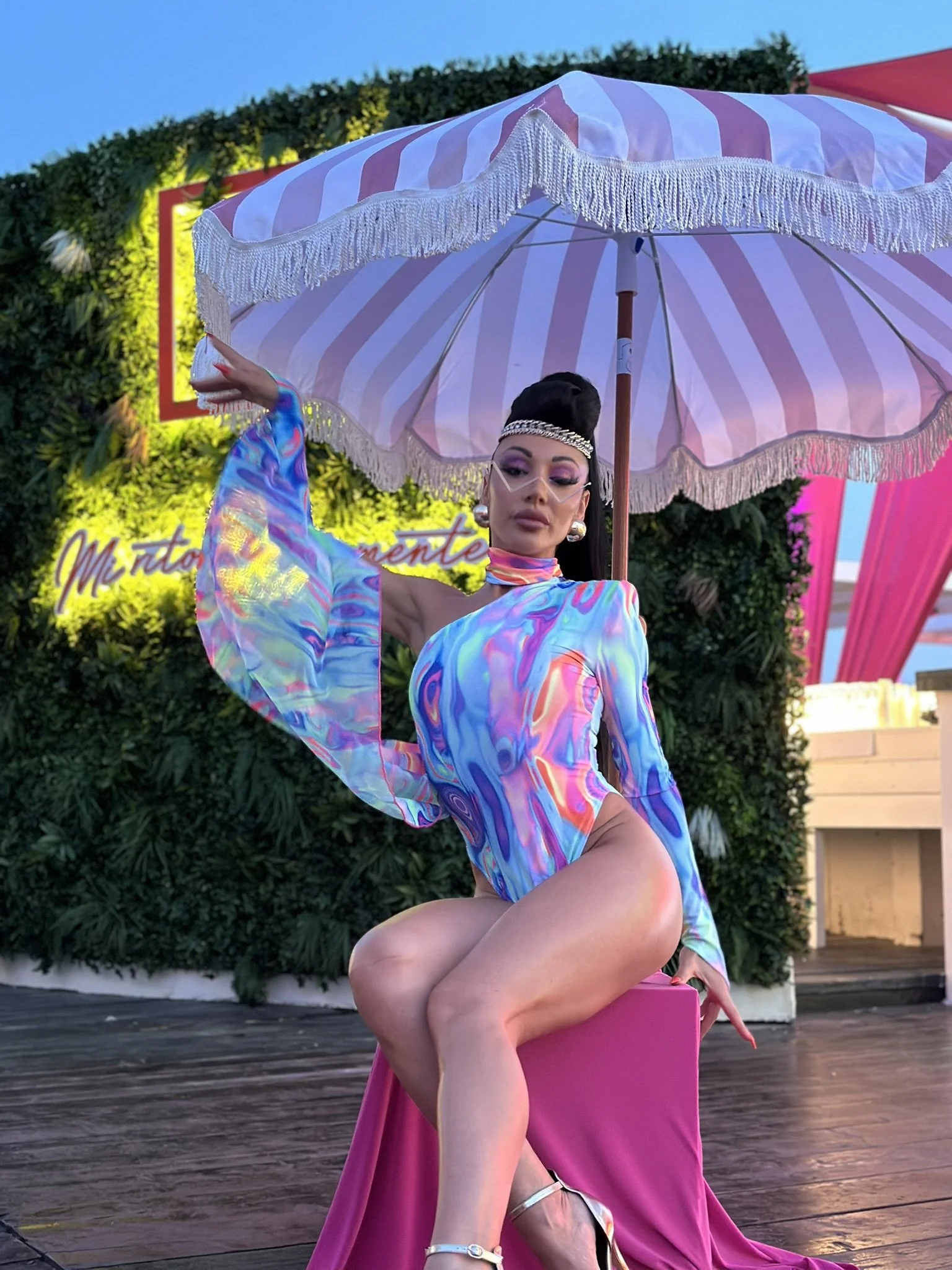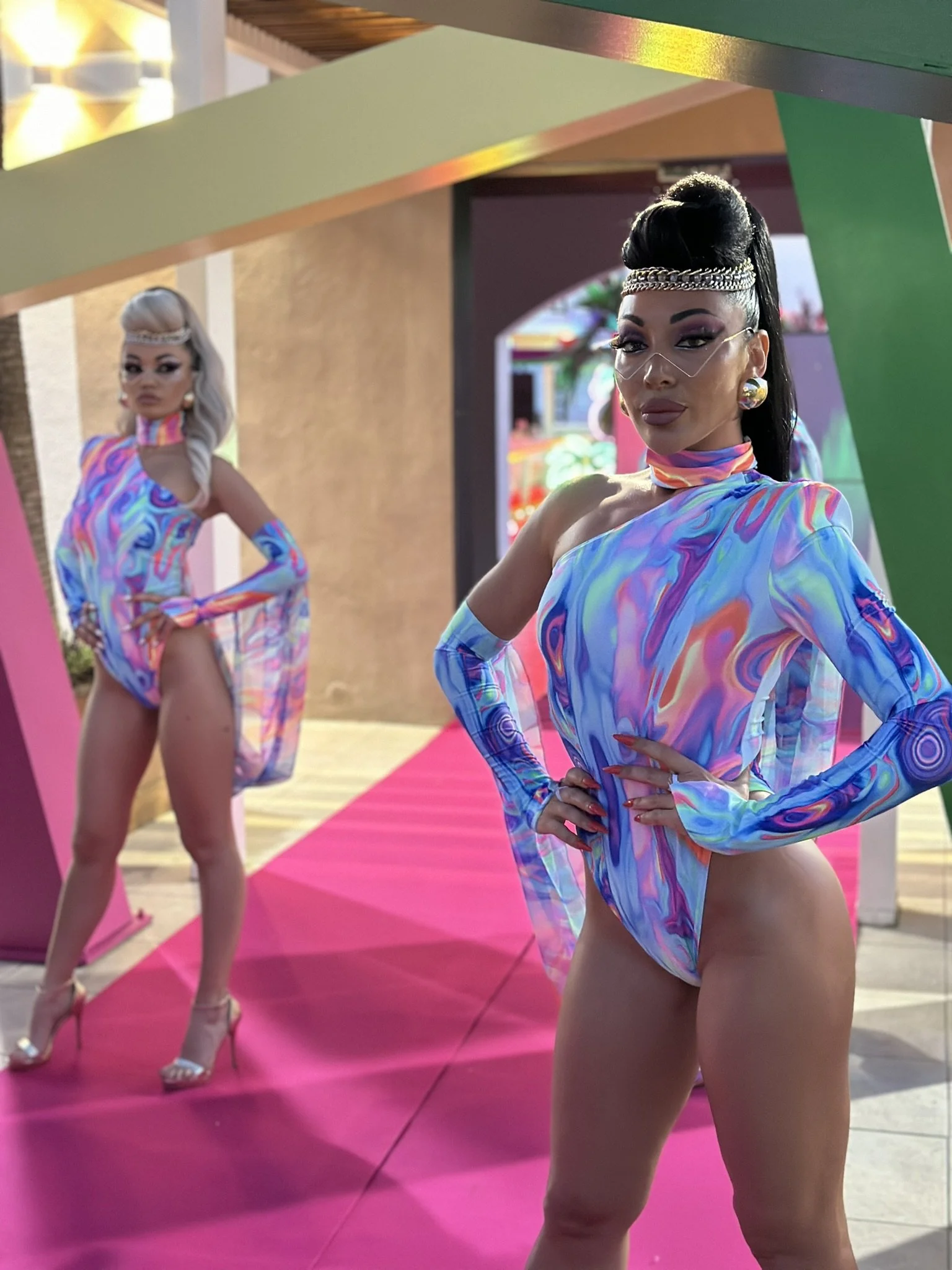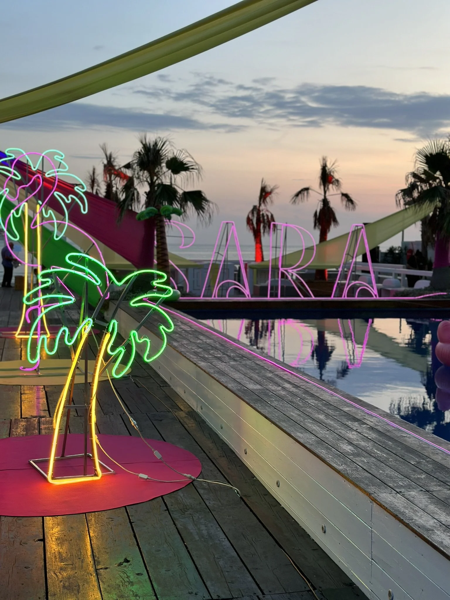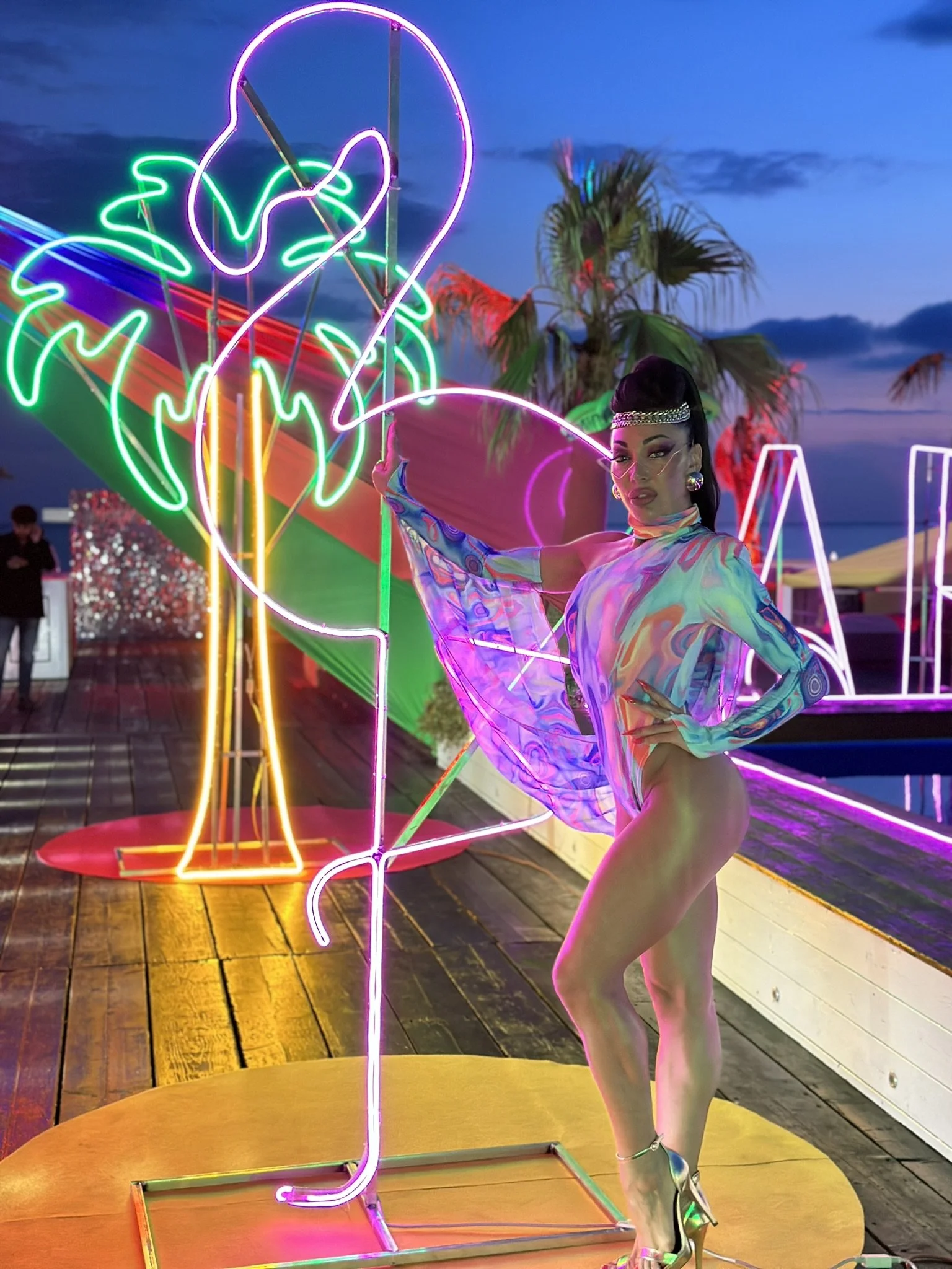 L’atmosfera? Esplosiva e frizzante! Palmeti stilizzati e fenicotteri rosa acceso in neon luminosi hanno dato vita a un set tropicale da sogno, mentre i colori protagonisti – giallo sole, fuxia intenso e verde lime – hanno trasformato ogni angolo in un'esplosione di energia visiva.